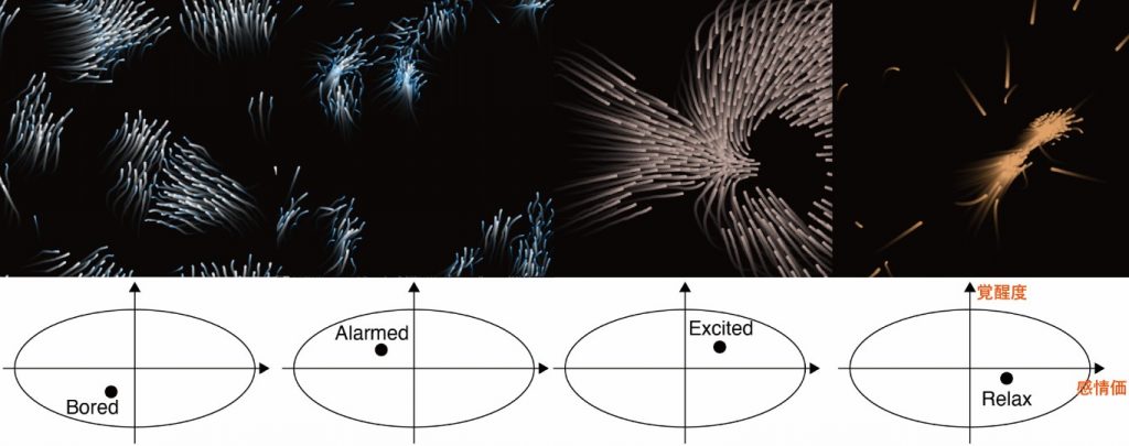 本研究は,ウェアラブル脳波計 MUSE 2 で脳波をリアルタイム計測し,覚醒度と感情価に基づく情動状態を推定した上で,その結果をスクリーン上の電子生命体の形態変化として表現する情動フィードバックシステムを提案する.生命体の形態や色彩がダイナミックに変化し,時系列での感情の蓄積/習慣/トレンドを体現することで,ユーザの感情認識とセルフレギュレーションを支援する.また,局所規則で複雑さを創り出す自己組織化的な生体集団アルゴリズムによって,人間の脳活動や情動変化の複雑さと生命らしさを表現することで,美的価値と長期的に利用する動機づけの促進を図る.
